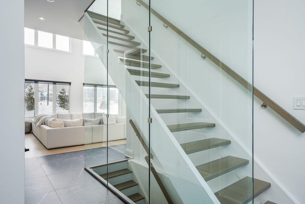 A custom European-style 8-foot entry door, enhanced exterior lighting, and clean architectural lines set the tone immediately. The purpose-built garage features high-lift tracks, EV rough-ins, and smart openers, reflecting the home’s thoughtful approach to modern living.