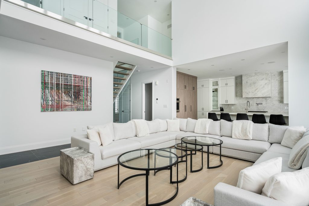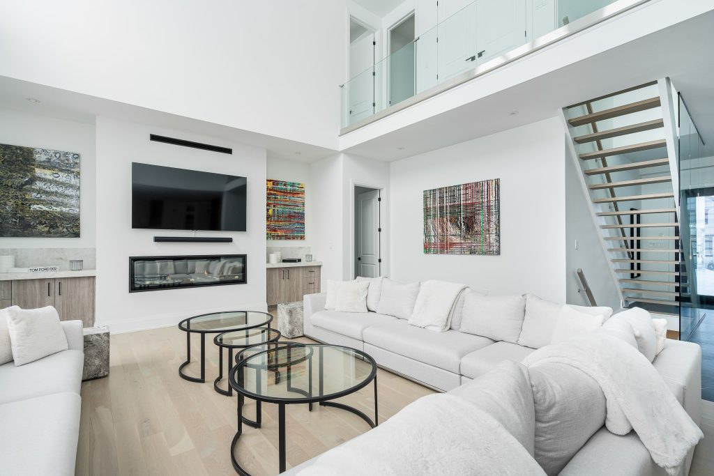 At the heart of the home is a dramatic 20-foot double-height great room, where expansive windows frame uninterrupted Blue Mountain views. A linear Napoleon gas fireplace, custom built-ins, and integrated smart features create a space that feels both grand and inviting.