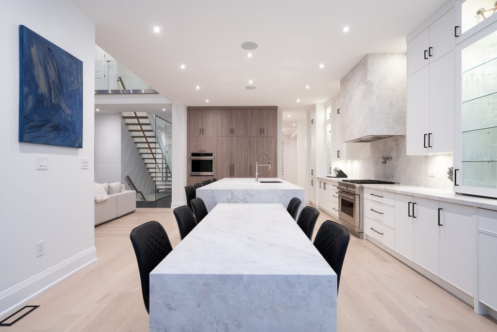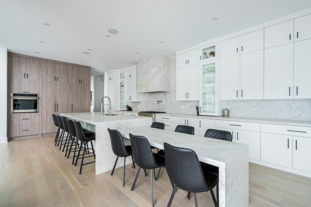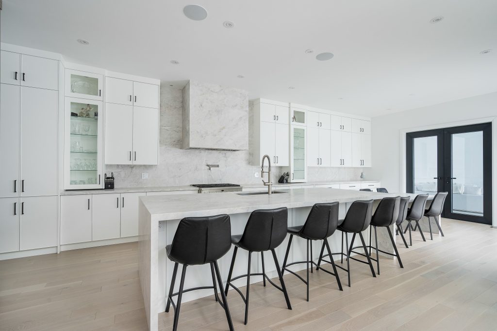 The chef’s kitchen is anchored by a spectacular 17-foot stone island, complete with a drop-down integrated dining table — a rare and thoughtful design detail that elevates everyday living and entertaining alike.