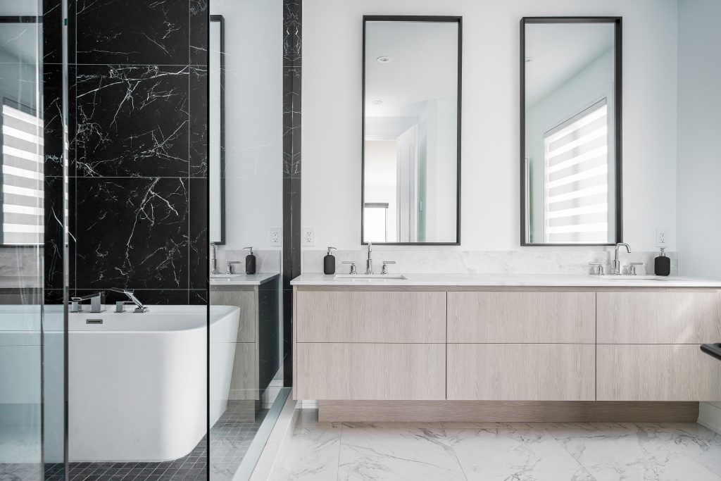 - Freestanding soaker tub and dual shower zones